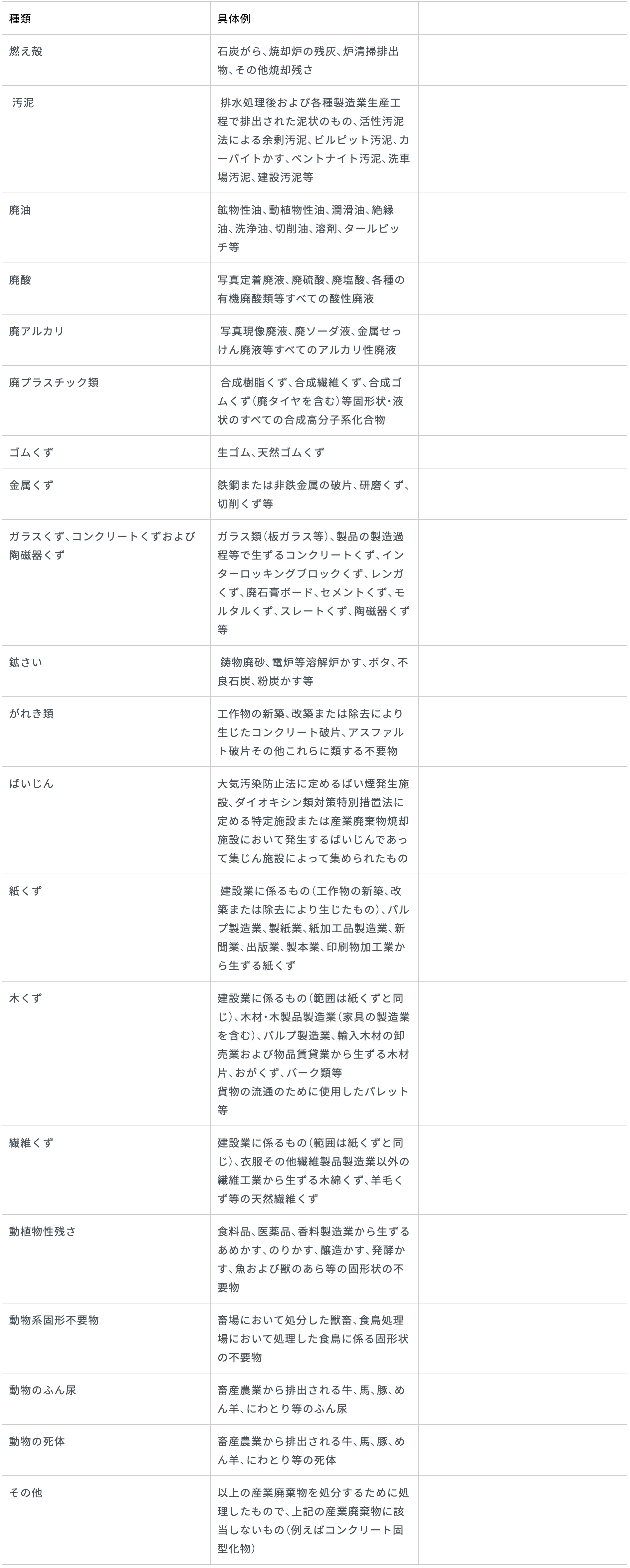 産業廃棄物とは事業活動にて生じた廃棄物のうち、廃棄物処理法で定められた20種類のものを指します。その内、輸入された廃棄物のうち航行廃棄物・携帯廃棄物は除外されます。上記以外のものは、事業活動の廃棄物であっても一般廃棄物の分類です。また、紙クズやダンボール、残飯、料理クズなどで事業所等から排出されるものは事業系一般廃棄物、同じものでも家庭から排出されるものは生活系一般廃棄物となります。